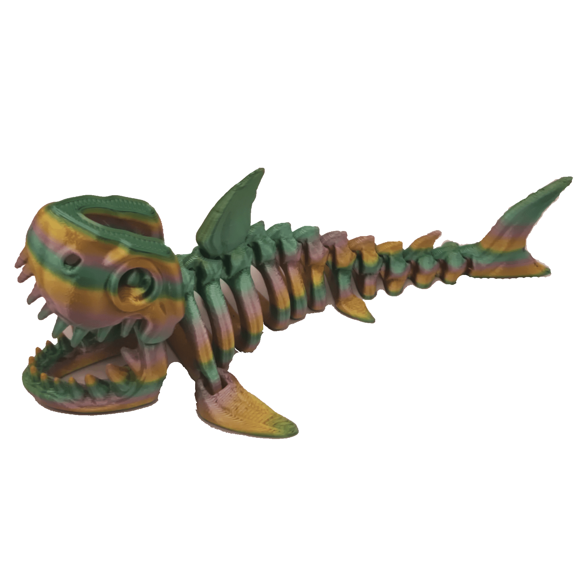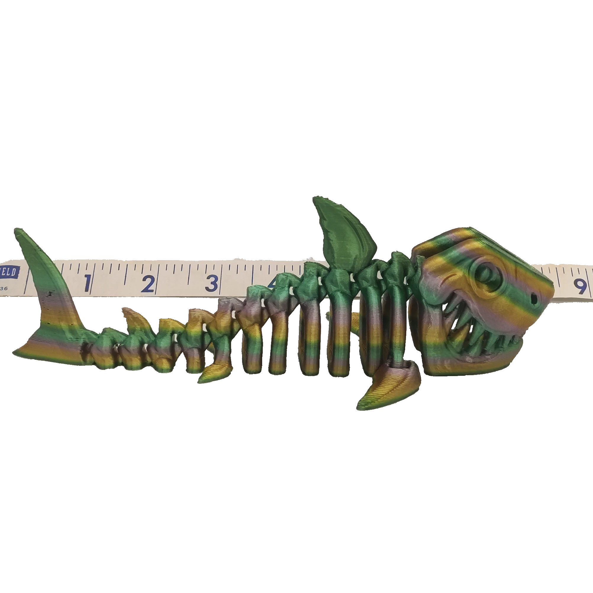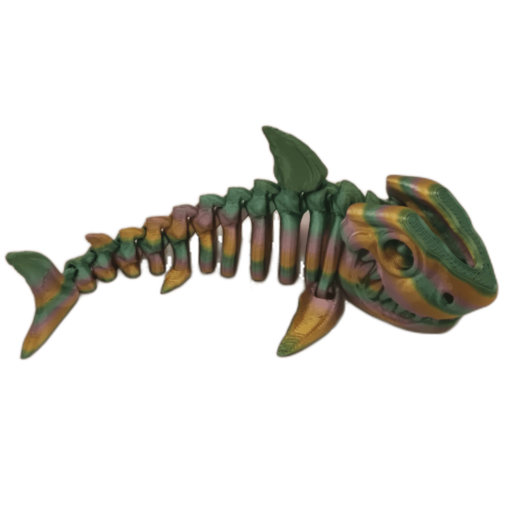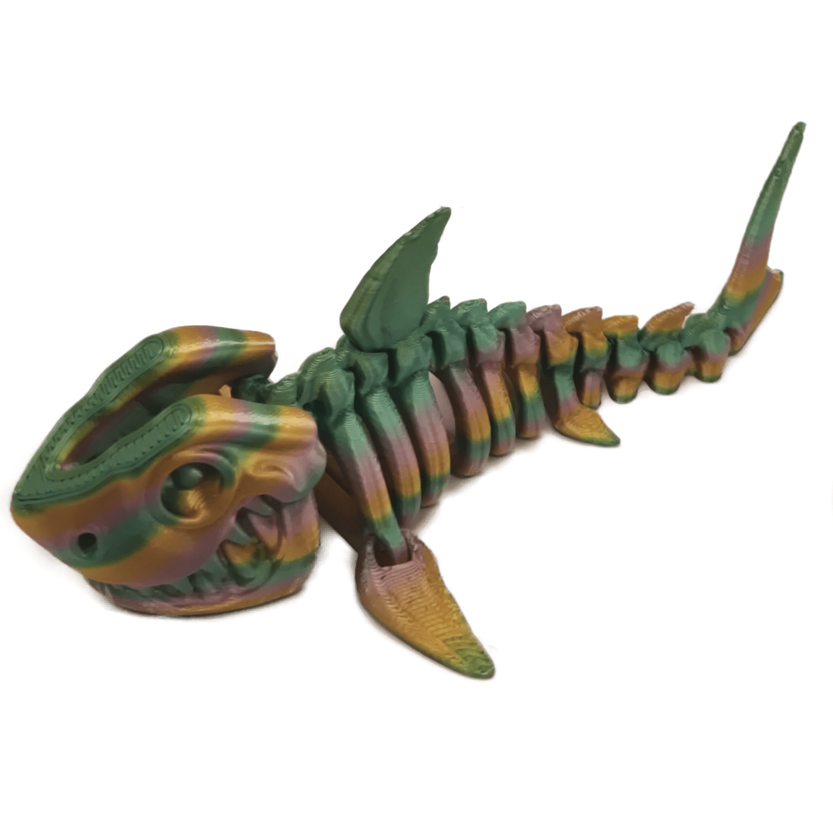 Designed by Flexi Factory, this Flexi Shark features an articulating body and an opening mouth, measuring approximately 8.5 inches from nose to tail.